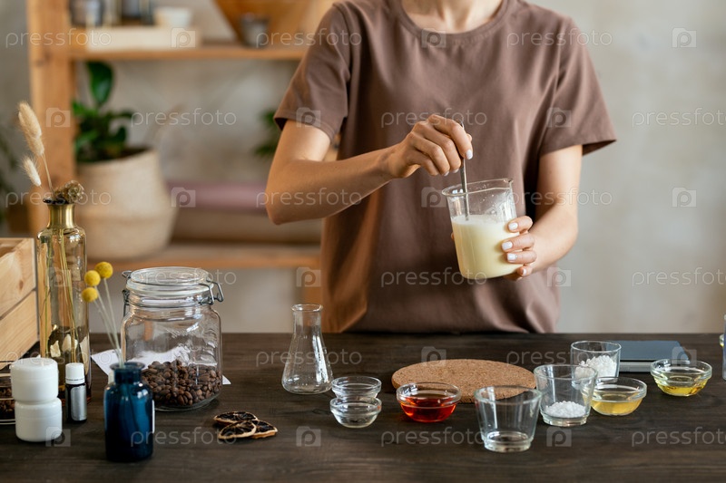 Молодая женщина держит стеклянную посуду с расплавленной массой мыла над столом со стаканными принадлежностями