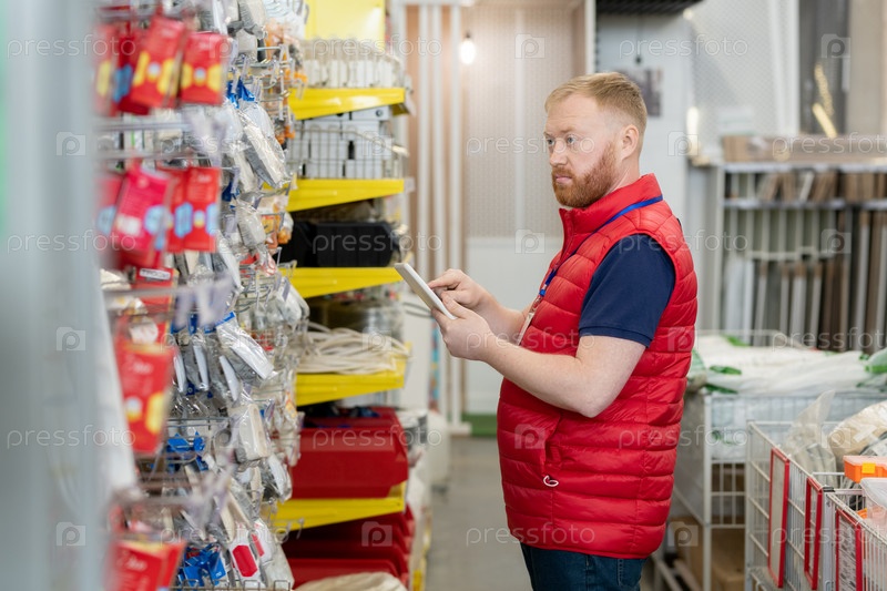 Мужчина-магазинщик в красной форме использует планшет во время проверки товаров в железном магазине