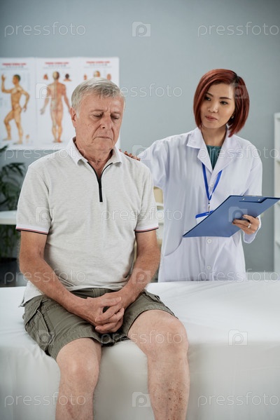 Успокаивающий старшего пациента доктор