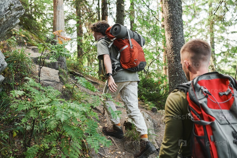 Задний вид молодых людей с рюкзаками, поднимающихся по крутым скалам во время походов в горах