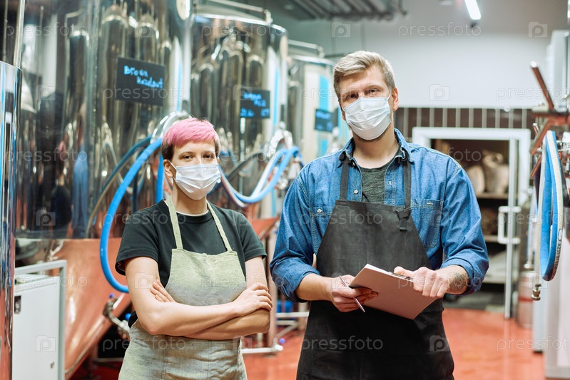 Молодые пивовары в фартуках и защитных масках стоят против больших стальных танков