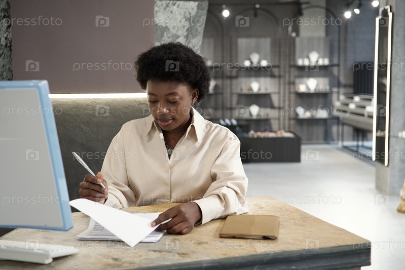 Молодой уверенный владелец ювелирного бутика подписывает документы