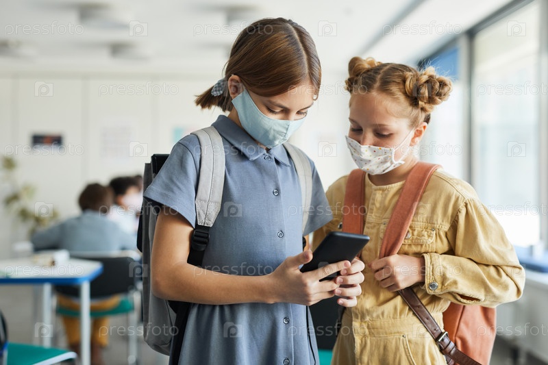 Молодые девочки, использующие смартфоны в школе