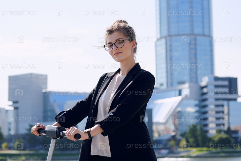Молодая блондинка-бизнесмен в формальной одежде и очках стоит на электрическом скутере на открытом воздухе