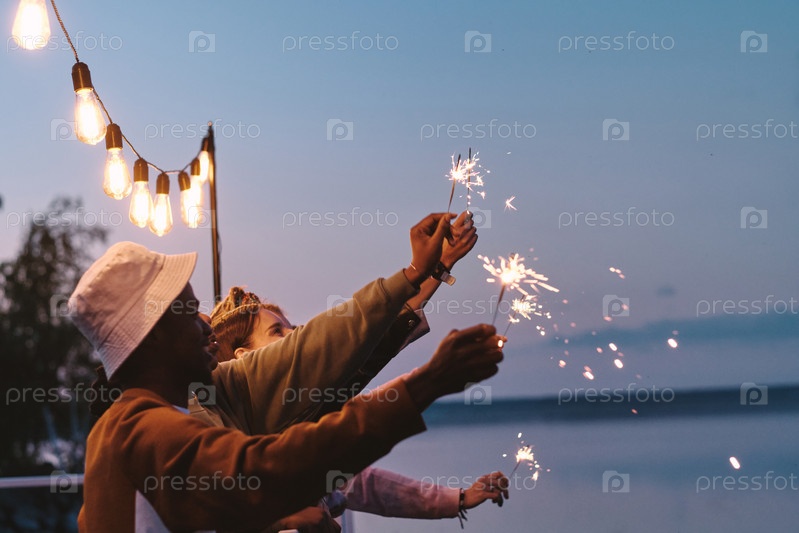 Боковой вид ряда в восторге друзей с бенгальскими огнями