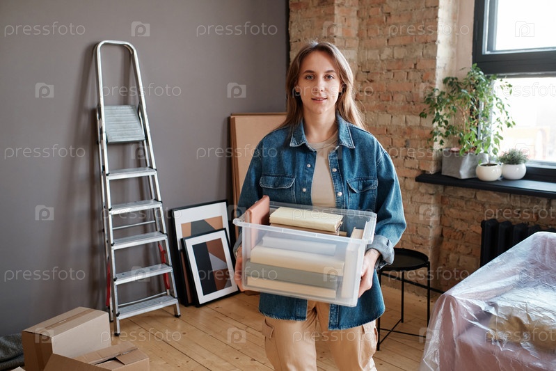 Горизонтальный средний портрет молодой женщины, переезжающей в новую квартиру, держащей пластиковый ящик с книгами и смотрящей на камеру