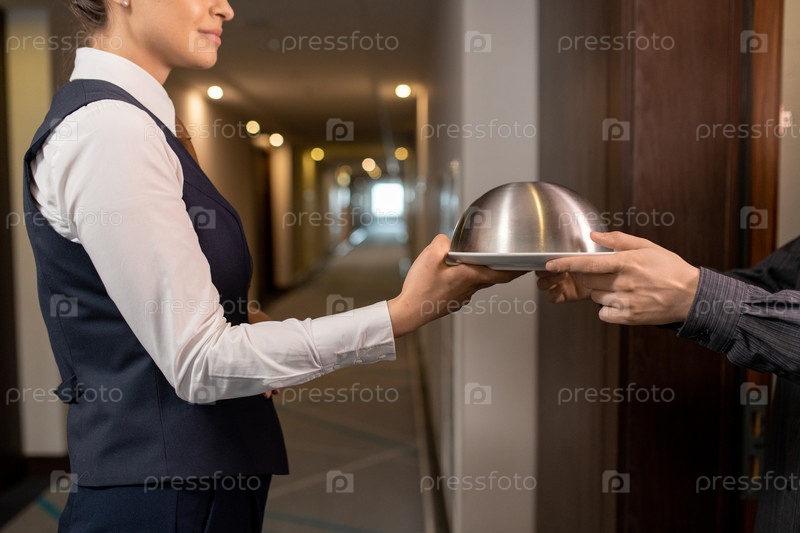 Менеджер отеля передает обед бизнесмену