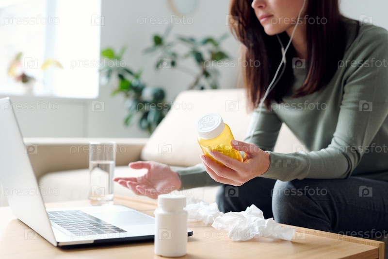Больная женщина держит бутылку таблеток во время консультации с онлайн-врачом