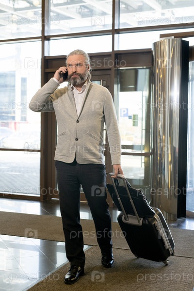 Зрелый бизнесмен со смартфоном за ухом, тянущий чемодан во время въезда в холл отеля