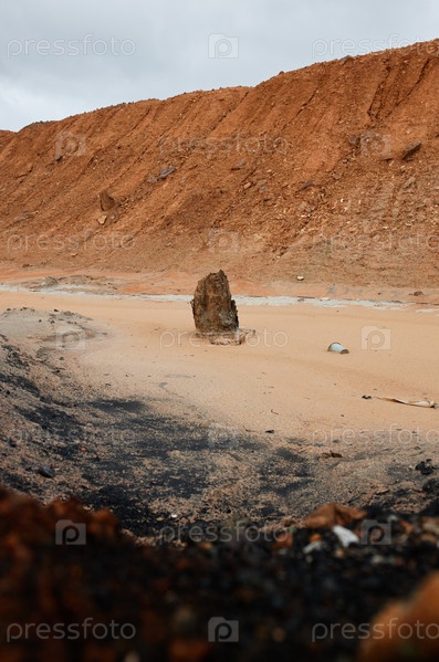 Мертвый ствол дерева на заброшенной территории с оранжевыми холмами и мусором, экологическая концепция