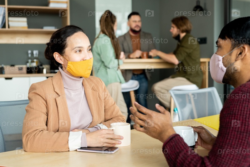 Молодые межкультурные менеджеры пьют кофе и обсуждают рабочие планы во время перерыва