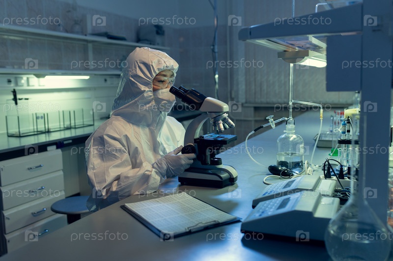 Молодая женщина-ученый в комбинезонах смотрит под микроскопом