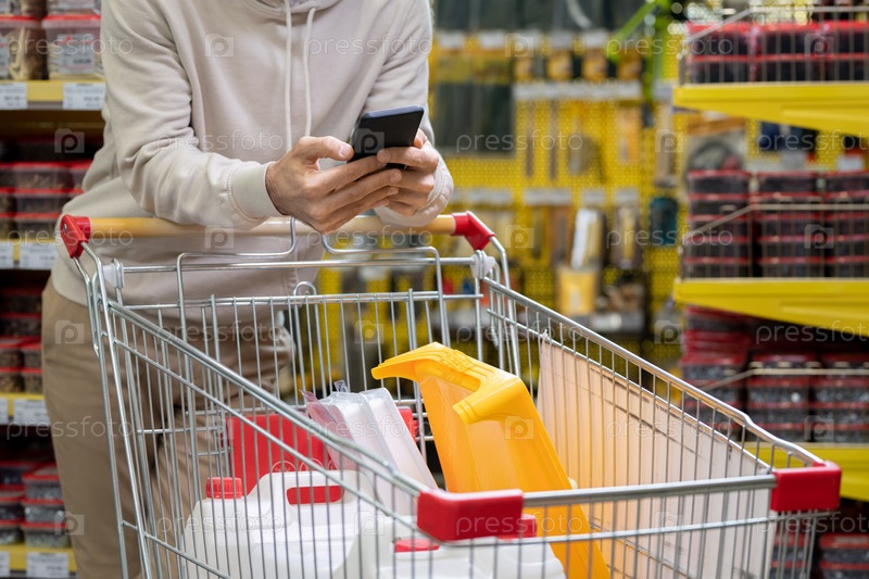 Молодой человек прокручивает смартфон над корзиной покупок