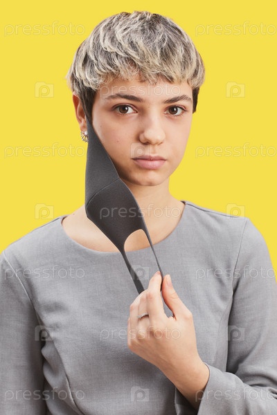 Молодая женщина снимает маску на желтом
