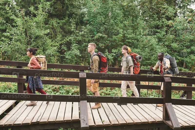 Группа молодых многонациональных туристов с рюкзаками, стоящих в очереди на мосту во время прогулки по лесу