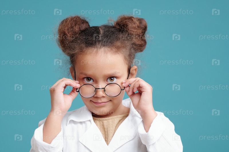 Серьезная маленькая девочка смотрит на тебя через очки