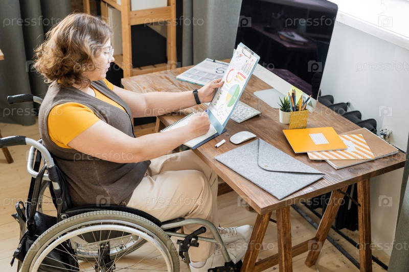 Молодая женщина-экономист в повседневной одежде сидит на инвалидной коляске перед компьютером