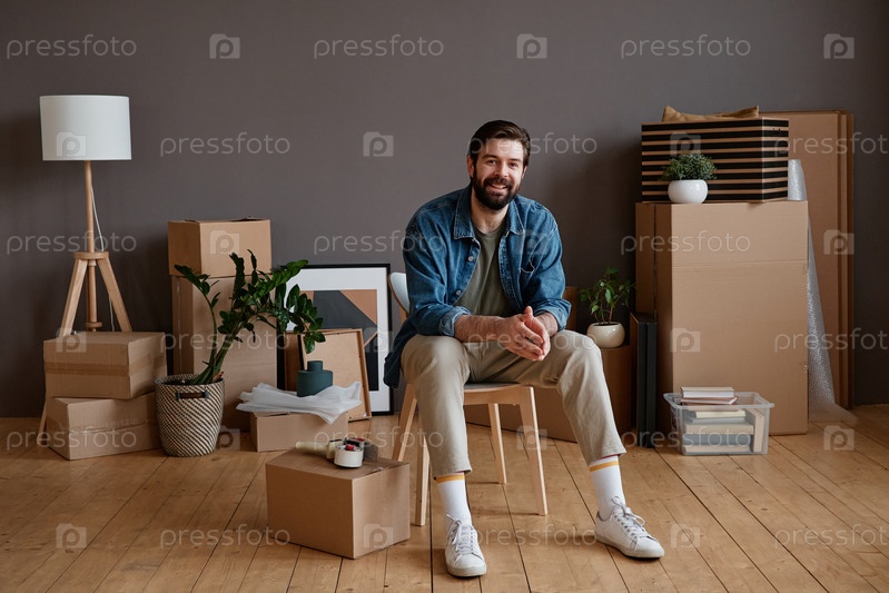 Горизонтальный снимок портрета молодого человека с бородой на лице, сидящего в верхней комнате со своими вещами, упакованными для переезда в новый дом и улыбающегося камере
