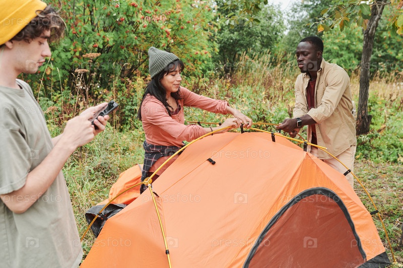 Молодой мужчина и молодая женщина фиксируют столбы и устанавливают палатки, в то время как его друг читает онлайн-учебное пособие по телефону