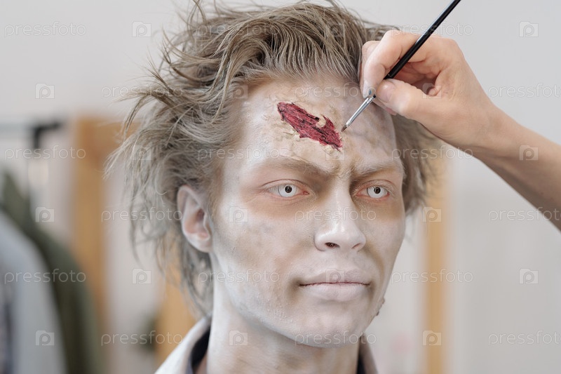 Молодой человек с гримом зомби, имеющий рану, нарисованную на лбу