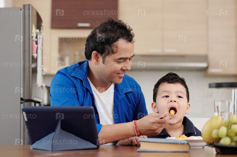 Отец кормит сына фруктовыми ломтиками