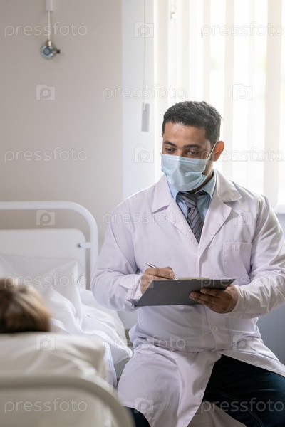 Мужчина-врач в белом халате и защитной маске делает заметки в медицинском документе