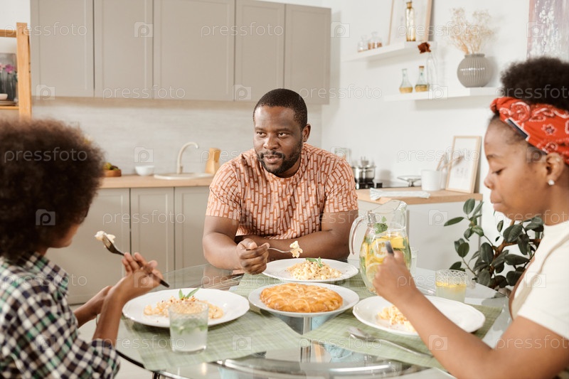 Молодая семья сидит за обслуживаемым столом и ужинает на кухне