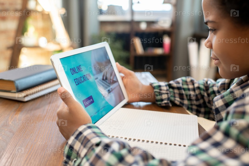 Боковой вид африканского школьника начальной школы, который смотрит на дисплей сенсорной панели