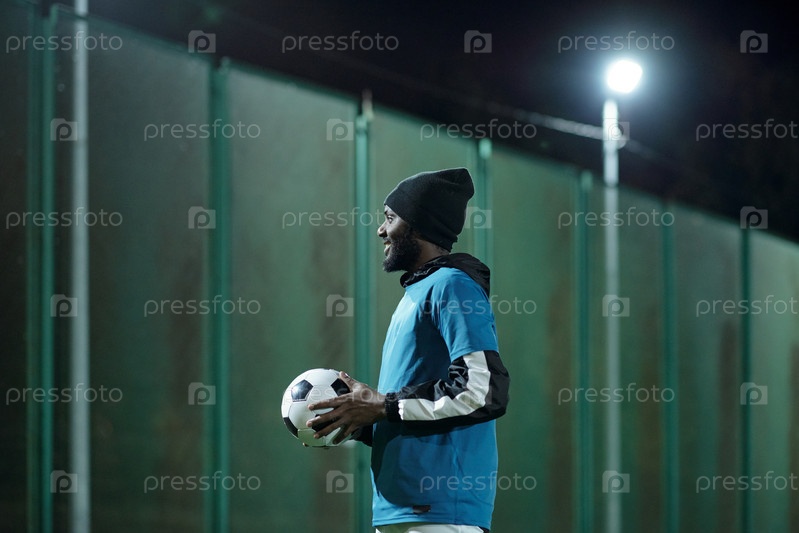 Счастливый молодой футболист с тренировкой футбольного мяча на стадионе