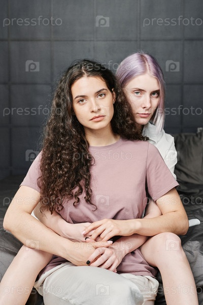 Женщина с фиолетовыми волосами, держащая руки вокруг талии своей подруги
