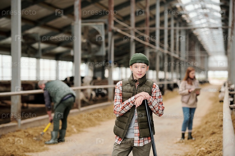 Улыбающийся подросток в рабочей одежде смотрит на тебя, стоя против родителей