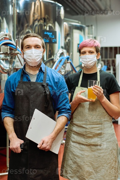 Два молодых уверенных в себе профессионалов пивоваренной промышленности в защитных масках, стоящих на цеху по производству пива