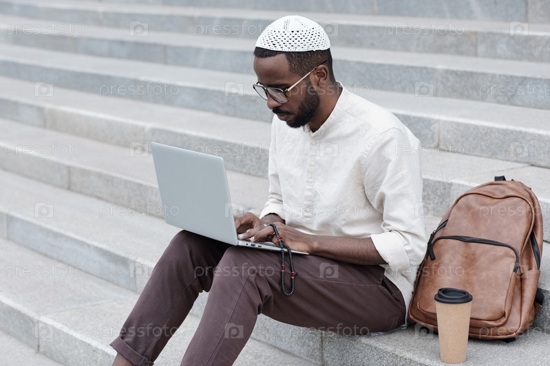 Концентрированный чернокожий мусульманский мужчина, использующий ноутбук