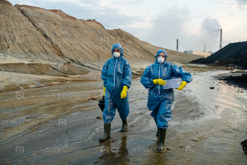 Две молодые женщины-ученые в синих защитных комбинезонах и резиновых сапогах движутся по загрязненной реке