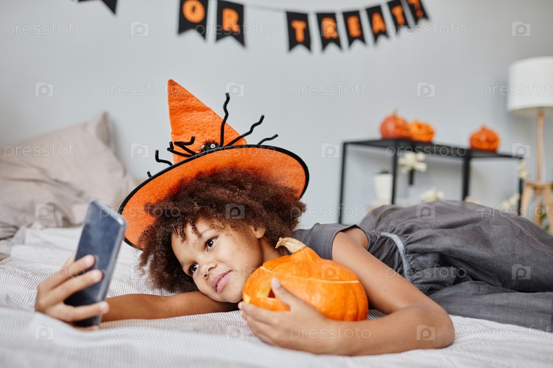 Афроамериканская девушка делает селфи на Хэллоуин в помещении