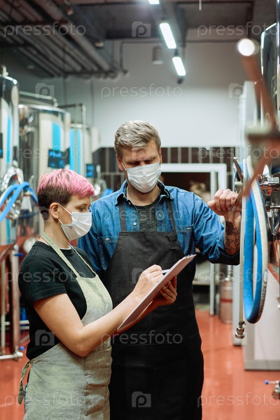 Два молодых работника крупного современного завода по производству пива обсуждают записи во время работы