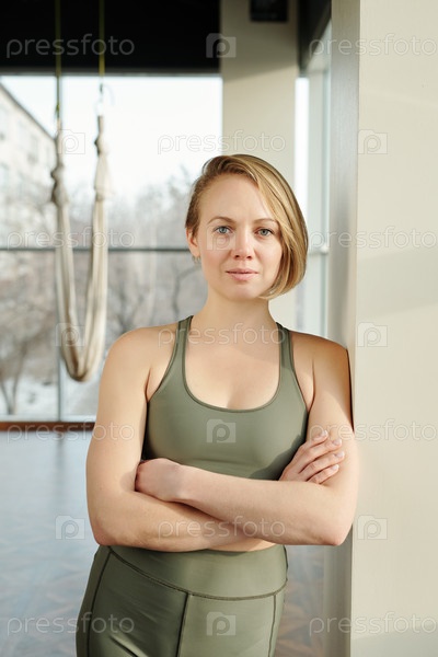 Молодая профессиональная тренерка в сером спортивном костюме держит руки скрещенными у груди, прислонившись к стене