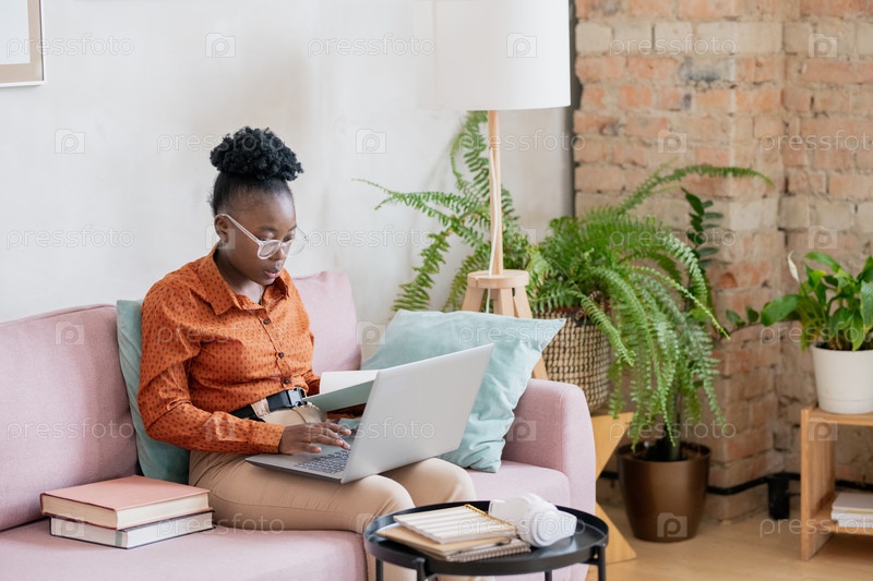 Молодая африканская женщина с ноутбуком на коленях сидит на диване