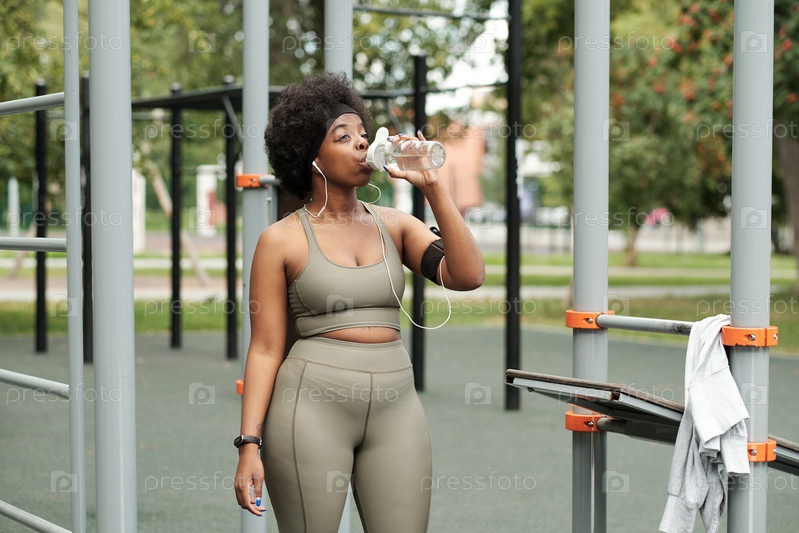Молодая жаждущая активная женщина пьет воду после тренировки