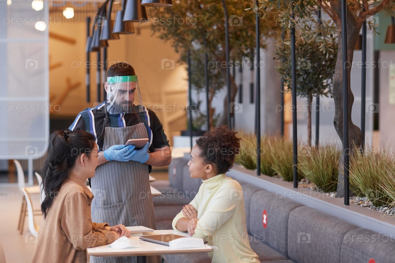 Официант носит защитное снаряжение в кафе