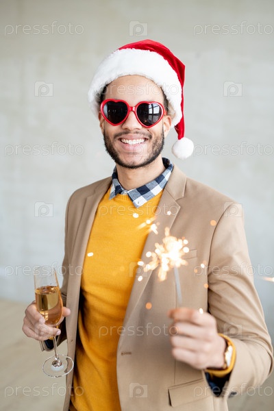 Счастливый молодой бизнесмен в повседневной одежде, шляпе Санты и солнцезащитных очках в форме сердца