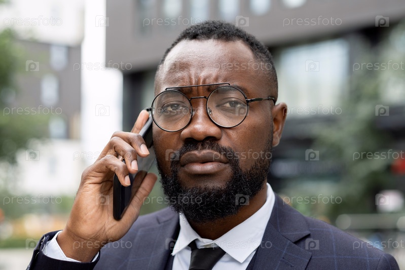 Лицо молодого элегантного бизнесмена в очках, разговаривающего по телефону
