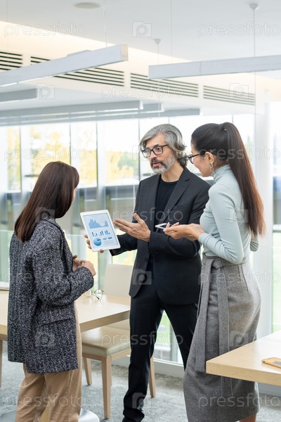 Две молодые элегантные бизнес-женщины слушают зрелого делового партнера с планшетом
