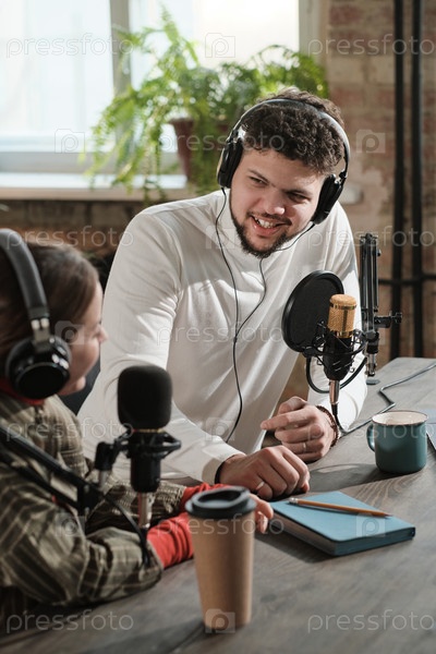 Мужчина интервьюирует женщину в студии