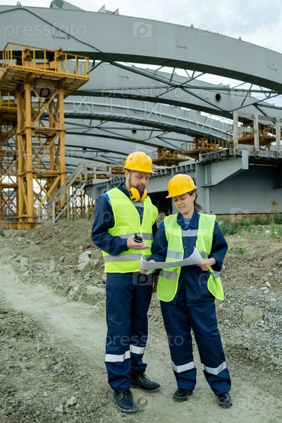 Два строителя смотрят на эскиз на чертеже, обсуждая его