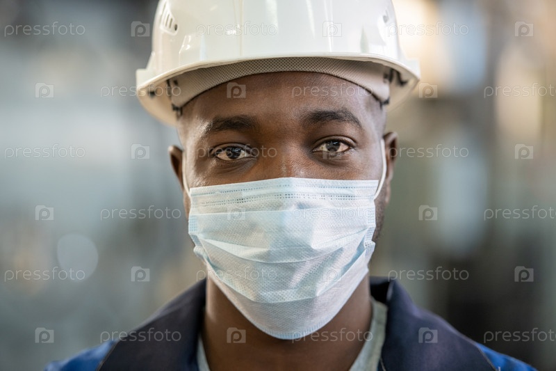 Молодой фабричный работник африканской этнической принадлежности в рабочей одежде, шляпе и защитной маске