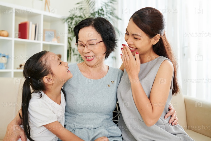 Мать и бабушка смеются над шуткой девочки