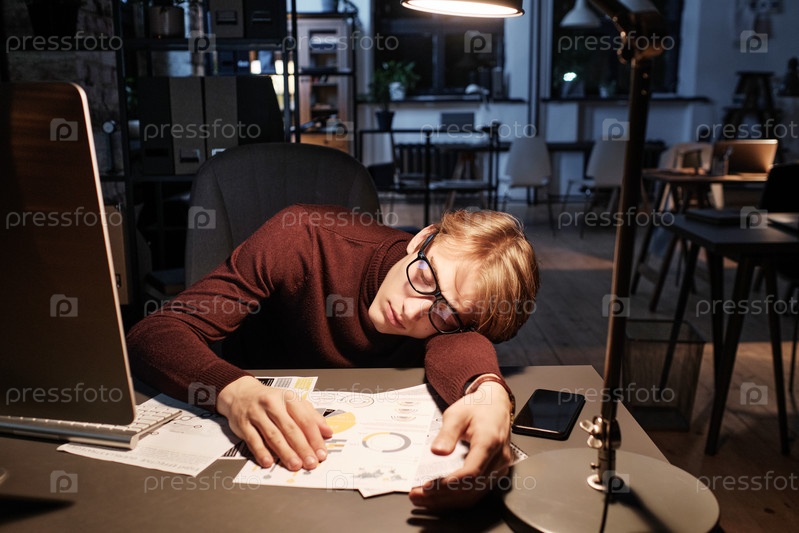 Усталый молодой менеджер в очках сидит за столом и спит на деловых документах в пустом темном офисе