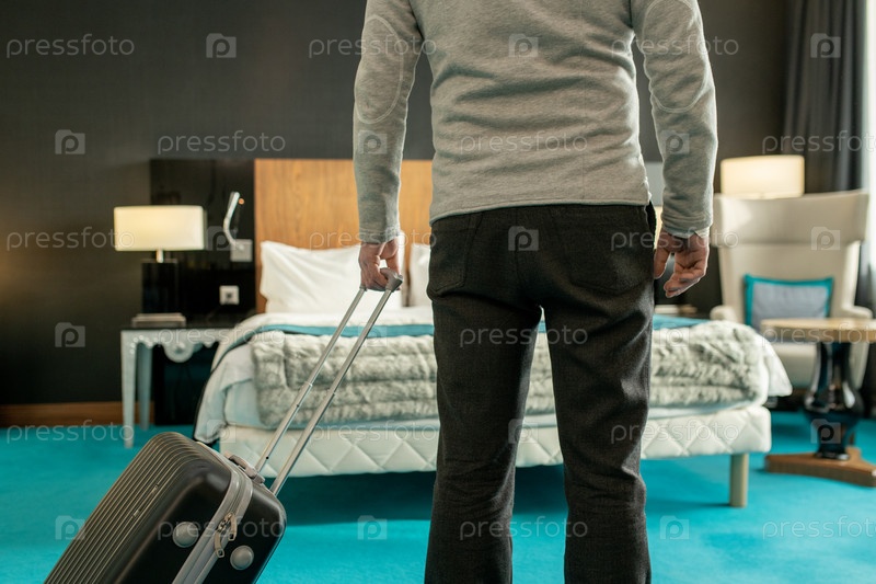 Задний вид мужчины в повседневной одежде, держащего ручку чемодана, стоя перед готовой кроватью