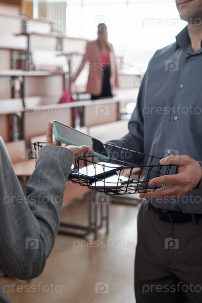 Современный профессор университета держит корзину, в то время как студенты кладут туда свои смартфоны